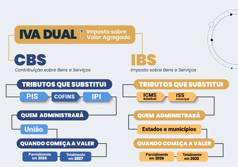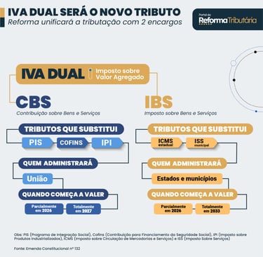 A grande estrela da reforma é o IVA Dual (Imposto sobre Valor Agregado). Ele substitui gradualmente cinco tributos atuais por três novas figuras tributárias: